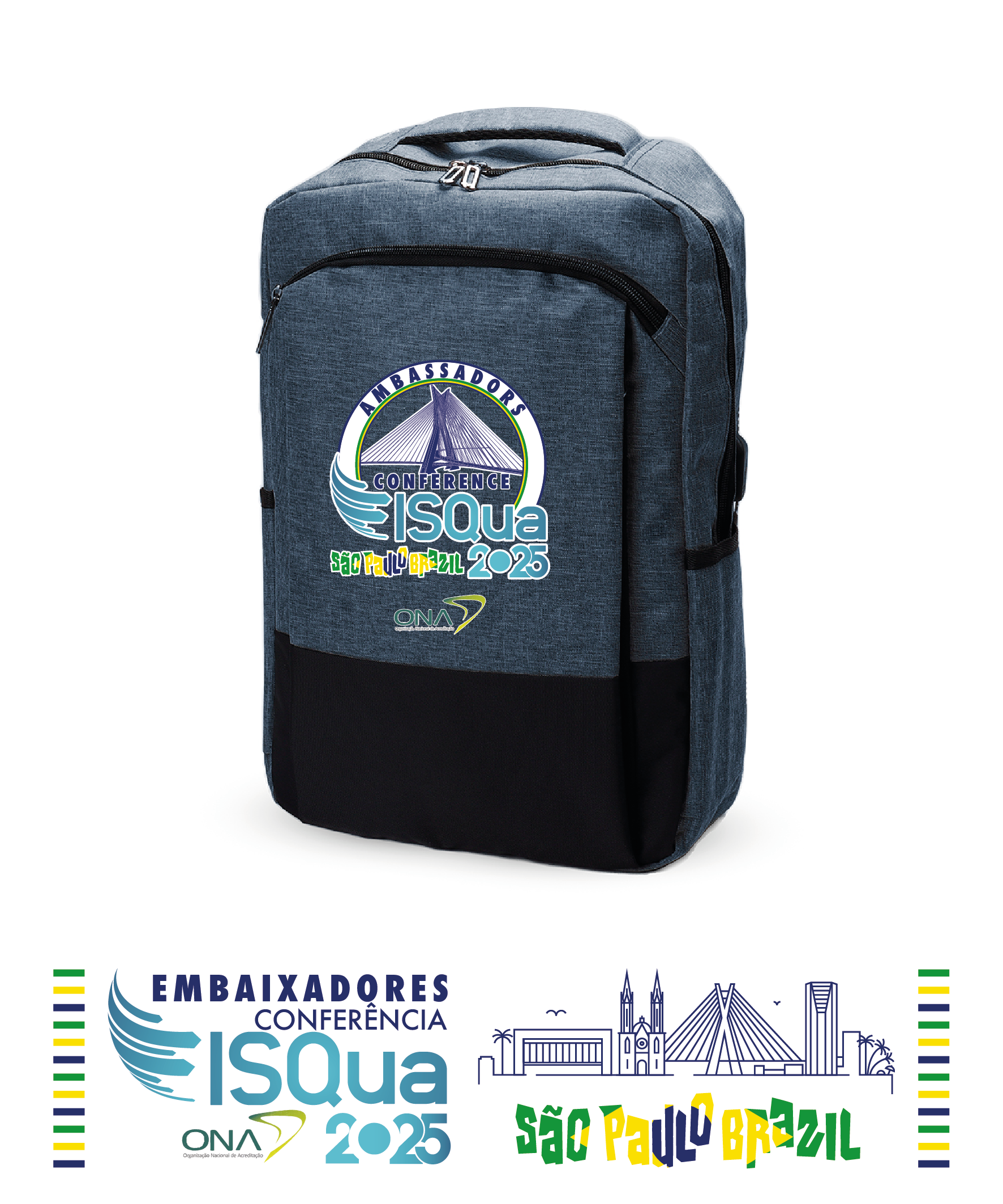 Parte externa: Bolso frontal com zíper, bolso pequeno na lateral direita. Conector USB. Alça de mão. Alça de ombro acolchoada.